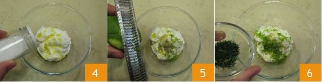 Salad 4, pimentad, aromatizad con la ralladura de lima 5 y con el hinojo picado 6.