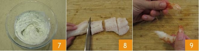Mezclad 7 para amalgamar y guardad en el frigorífico hasta el momento de servir. Cortad en trozos el filete de bacalao ya limpio 8 y luego pelad los langostinos 9 siguiendo nuestra guía: Cómo limpiar los gambones. Una vez limpios, obtendréis unos 150 g de langostinos.