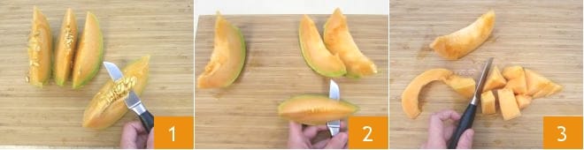 Para preparar los chupitos de melón con paquetitos de feta, comenzad con la limpieza del melón. Cortad el melón en gajos y removed las semillas y los filamentos internos 1. Luego, pasad el cuchillo entre la cáscara y la pulpa para pelar cada rodaja 2 y finalmente cortad la pulpa en trozos grandes 3.
