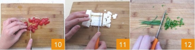 Finalmente, cortad las tiritas para obtener daditos 10. Reservadlos y pasad a la feta. Cortadla primero en tiritas y luego en daditos 11 aproximadamente del mismo tamaño que los de los tomatitos. Picad luego finamente el cebollino 12.