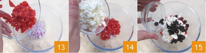 En un bol grande, verted la cebolla, los tomatitos 13, la feta 14, las aceitunas en rodajas 15