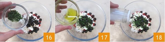 Y el cebollino 16. Aderezad con el aceite 17 y una pizca de sal 18: será suficiente poco, porque la feta es muy salada de por sí.