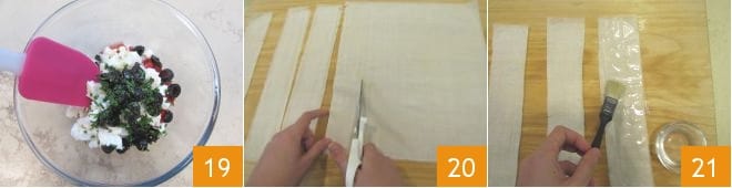 Mezclad bien para amalgamar los ingredientes 19 y reservad. Luego, disponed dos hojas de pasta filo de 48x34 cm una sobre la otra, y colocadlas sobre la superficie de trabajo, manteniendo el lado largo en la base. Con la ayuda de unas tijeras, cortad 8 tiras de 6 cm de ancho 20. Pincelad las tiras con un poco de agua para rehidratarlas 21.