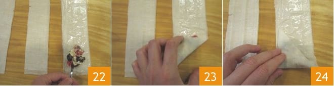 Colocad una pequeña cucharada de relleno en la base de la tira de pasta filo 22, y doblar un extremo para crear un triángulo que encierre el relleno 23. Doblad de la misma manera el triángulo recién formado sobre la tira 24