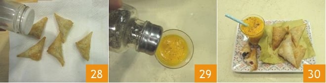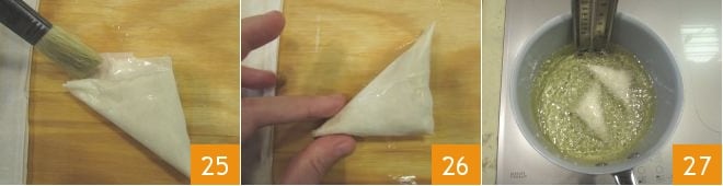 y continuad de esta manera hasta terminar la tira de pasta. Pincelad el último extremo con un poco de agua 25 antes de cerrarlo también, para sellar vuestro paquetito 26. Realizad de esta manera los otros 7 paquetitos, luego repetid con las otras 2 hojas de pasta filo para realizar los últimos 8 paquetitos. En total obtendréis 16. Calentad el aceite de semillas en una cacerola profunda, y cuando alcance la temperatura de 170-180°, sumergid un par de paquetitos a la vez y freídlos 27 aproximadamente medio minuto por lado hasta que estén dorados.