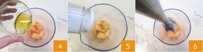 Colocad los trozos de melón en el vaso de la batidora y añadid el aceite 4 y una pizca de sal 5. Con la batidora de mano, batid cuidadosamente 6