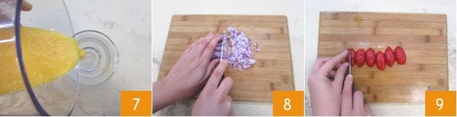Y luego transferid el puré obtenido a una jarra 7. Colocad la jarra en la nevera para mantener fresco vuestro batido de melón. Mientras tanto, ocupémonos de los paquetitos, comenzando con los ingredientes del relleno. Picad finamente la cebolla roja 8 y reservadla. Cortad los tomatitos por la mitad a lo largo y, cortándolos a lo largo, obtened tiritas 9.