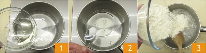 Para realizar los churros deliciosos, comienza con la masa: en un cazo vierte el agua, el aceite de semillas 1 y la sal 2, lleva a ebullición. Mientras tanto, tamiza la harina aparte. Tan pronto como el agua esté a punto de hervir, retira el cazo del fuego y añade la harina de golpe 3.