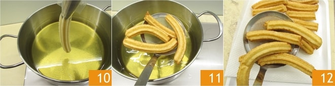 Calienta el aceite de semillas en una olla grande hasta alcanzar una temperatura de 180°, luego exprime la masa directamente en el aceite cortándola a una longitud de aproximadamente 10 cm con la ayuda de un cuchillo 10. Fríe los churros durante aproximadamente 3-5 minutos girándolos frecuentemente para que se doren uniformemente por todos los lados, luego escúrrelos 11 y transfiérelos a papel absorbente para eliminar el exceso de aceite 12.