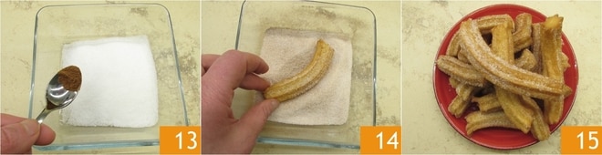 Mientras tanto, mezcla el azúcar granulada con la canela (si lo prefieres) 13. Pasa los churros deliciosos aún calientes por el azúcar aromatizado y cúbrelos completamente 14. ¡Tus churros deliciosos están listos para ser disfrutados junto con una taza de chocolate caliente 15!
