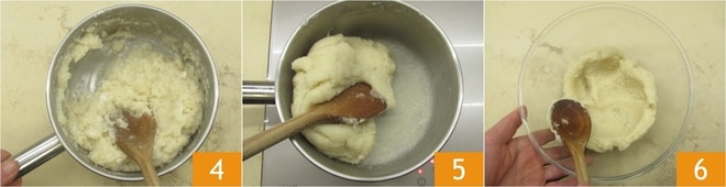 Mezcla vigorosamente con una cuchara de madera para obtener una mezcla firme y consistente 4, luego vuelve a poner el cazo en el fuego y continúa mezclando durante al menos 3 minutos a fuego medio hasta que se forme una película blanca en el fondo 5. En este punto, vierte la mezcla en un bol y extiéndela por las paredes con la ayuda de la cuchara de madera para que se enfríe más rápido 6. Deja templar durante 10 minutos.