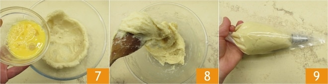 Cuando la mezcla esté templada, añade el huevo previamente batido 7 y mezcla enérgicamente para incorporarlo hasta que la masa esté lisa, compacta y homogénea 8. Transfiere la masa obtenida a una manga pastelera con boquilla de estrella de tamaño medio (nosotros usamos una de 15 mm) 9.