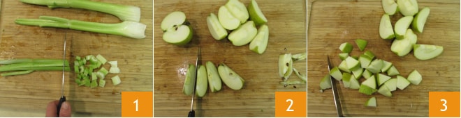 Para preparar el chutney de manzanas al azafrán debéis haber esterilizado tarros y tapas como se indica en el cuadro al final de la receta. Luego proceded limpiando el apio: peladlo y cortadlo en trozos grandes 1. Laváis, secáis y luego cortáis por la mitad las manzanas, quitáis el corazón y sin pelarlas las cortáis primero en rodajas 2 y luego en trozos grandes 3.