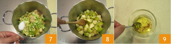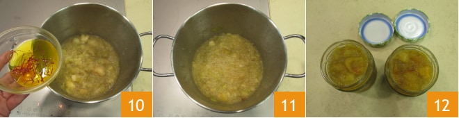 Al final de la cocción vertéis los pistilos con su agua 10, mezcláis y dejáis en el fuego durante 2-3 minutos más 11. Apagáis y una vez enfriado vuestro chutney de manzanas al azafrán está listo 12.