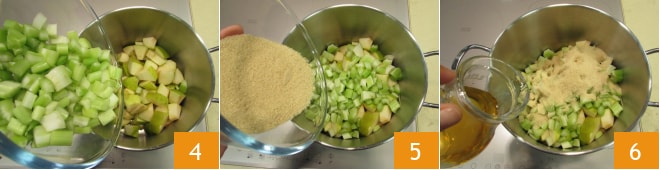En una olla grande vertéis las manzanas, el apio 4, el azúcar moreno 5 y el vinagre de manzana 6.