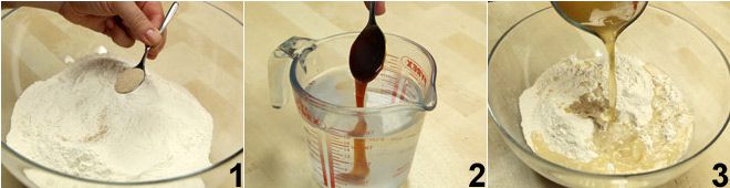 Aquí está cómo proceder para preparar la ciabatta sin amasar. Vierte la harina en un cuenco grande y luego añade la levadura de cerveza deshidratada 1. Disuelve la sal y la malta en el agua tibia 2, mezcla bien y luego vierte la mezcla en el cuenco 3 con harina y levadura.