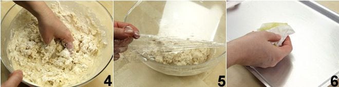 Mezcla lo justo para amalgamar los ingredientes 4, luego cubre el cuenco con film transparente 5 y deja que todo fermente a temperatura ambiente (pon el cuenco dentro del horno apagado) durante al menos 18 horas. Transcurrido el tiempo indicado, la masa deberá tener una consistencia llena de burbujas y bastante pegajosa. Coge una bandeja para horno, úntala ligeramente 6 con aceite de oliva virgen extra.
