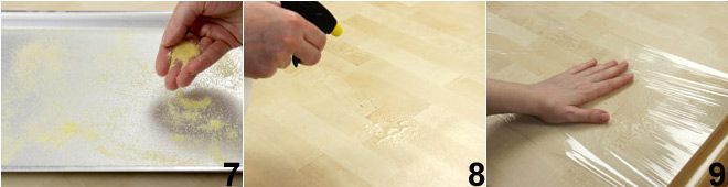 y espolvoréala con harina de maíz 7. En una superficie de trabajo rocía un poco de agua 8 y coloca encima un trozo de film transparente 9.