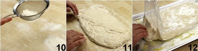 Espolvorea el film transparente con abundante harina 00 10. Vierte sobre el film enharinado la masa 11 y, enharinándote las manos, dale una forma bastante plana y alargada. Acerca el film a la bandeja y con un movimiento decidido vuelca la masa encima 12.