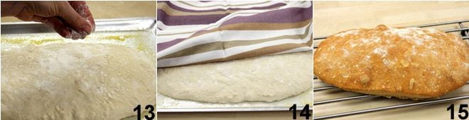 Devuélvele una forma plana y alargada, espolvorea la superficie con harina 13 y luego cubre la ciabatta con un paño limpio 14 y déjala fermentar durante otras dos horas a 30°. Transcurridas las dos horas, hornéala en horno ya caliente durante 40 minutos a 220°. Una vez que la ciabatta sin amasar tenga una corteza color avellana, retírala del horno 15.