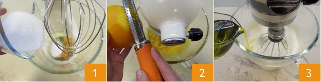 Para preparar el bizcocho con aceite de oliva, comienza colocando los huevos a temperatura ambiente en el bol de una batidora de pie equipada con varillas y añade también el azúcar, con el pellizco de sal 1 (también puedes usar una batidora eléctrica). Acciona la batidora y trabaja bien la mezcla, luego añade la ralladura de naranja 2, y a continuación el aceite de oliva en hilo 3.