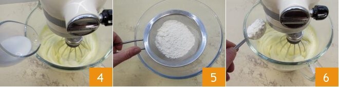 Cuando el aceite se haya absorbido, continúa con la leche a temperatura ambiente, siempre vertida en hilo 4. Luego tamiza la harina y la levadura en un bol 5, y añade los ingredientes secos poco a poco a la mezcla 6.