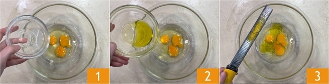 Para preparar la cicerchiata, vierta los huevos en un bol junto con el licor 1, el aceite 2 y la cáscara rallada del limón 3.