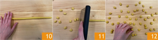 Forme cilindros de 1 cm de grosor 10, luego córtelos en trozos de 1 cm de longitud 11. Redondee los trocitos de masa con los dedos para obtener bolitas 12.
