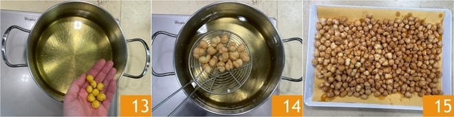 En este punto, lleve el aceite de semillas a una temperatura de 200° y fría pocas bolitas a la vez 13. Cuando estén doradas de manera uniforme, escúrralas 14 y deje enfriar sobre papel de cocina 15.