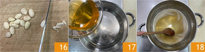 Mientras tanto, corte las almendras en rodajas 16. Vierta la miel en una cacerola grande 17 y caliéntela suavemente durante unos minutos 18.