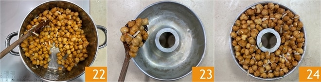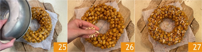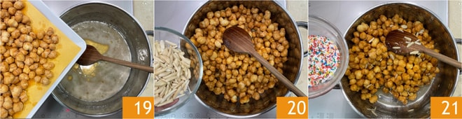 Cuando la miel haya cambiado de color, apague el fuego y agregue las bolitas fritas 19. Mezcle bien para cubrirlas uniformemente, luego agregue las almendras 20 y las virutas 21, asegurándose de reservar algunas para la decoración.
