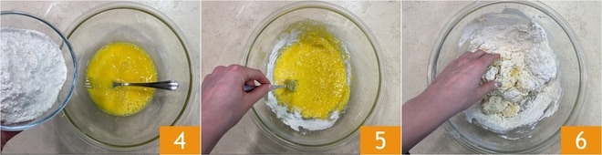 Bata todo con un tenedor, luego agregue la harina 4. Mezcle los ingredientes en el bol primero con el tenedor 5 y luego con las manos 6.