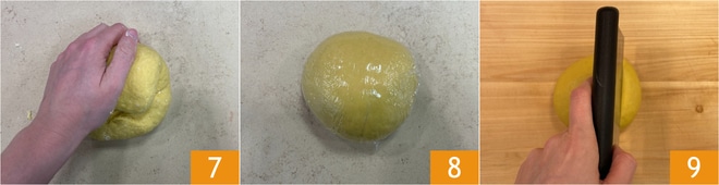 Transfiera la mezcla a la superficie de trabajo y continúe trabajando con las manos 7 hasta obtener una masa lisa y homogénea, similar a la de la pasta fresca. Forme una bola y envuélvala en film transparente, luego deje reposar a temperatura ambiente durante unos 15 minutos 8. Pasado este tiempo, divida la masa en pequeñas porciones 9.