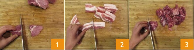 Para preparar el Ciffe e Ciaffe, primero corte la carne en trozos grandes: el lomo 1, la panceta 2 y las carrilleras 3.