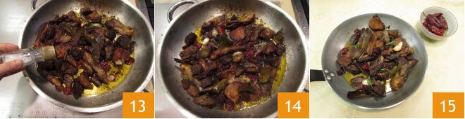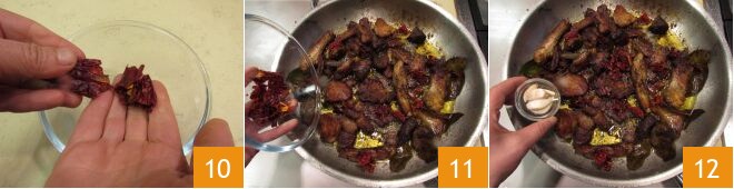 Mientras tanto, trocee los pimientos secos en un bol eliminando las semillas internas 10. Cuando falten 10 minutos para el final, vierta los pimientos secos 11 y el ajo en camisa 12.