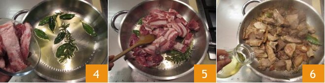 En una cazuela grande caliente el aceite, añada las hojas de laurel y las ramitas de romero para dar sabor y luego vierta la carne: las costillas enteras 4 y los trozos restantes cortados groseramente 5. Dore la carne durante 5-7 minutos a fuego alto y luego desglase con el vino 6. Deje evaporar.