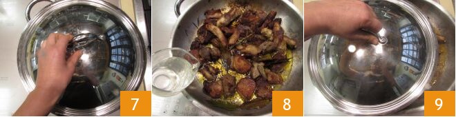 Cubra con una tapa 7 y deje cocinar a fuego bajo, removiendo con frecuencia, durante unos 30 minutos. Verifique que la carne no se seque, luego vierta 100 g de caldo de verduras 8, remueva y cubra de nuevo con la tapa 9. El Ciffe e Ciaffe deberá cocinarse en total durante unos 50 minutos, pero el tiempo puede variar según el tamaño de la carne.