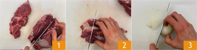 Para preparar el jabalí guisado, lo primero que hay que hacer es cortar la carne, primero en rodajas 1 y luego en trozos 2. Cortad la cebolla en rodajas, previamente pelada 3.