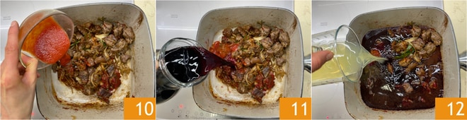 Verted el puré de tomate 10, mezclad y cocinad 2 minutos. Agregad el vino 11 y dejad evaporar toda la parte alcohólica. Añadid finalmente el caldo de carne 12 y llevad a ebullición.