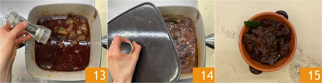 Ajustad de sal y pimienta 13. Mezclad, cubrid con una tapa 14, bajad el fuego al mínimo y cocinad durante unas 3 horas, removiendo de vez en cuando, hasta que la carne esté tierna. Si es necesario, para prolongar la cocción, podéis añadir agua u otro caldo. Servid y decorad con una hoja de laurel. ¡Vuestro jabalí guisado está listo para ser disfrutado caliente 15!