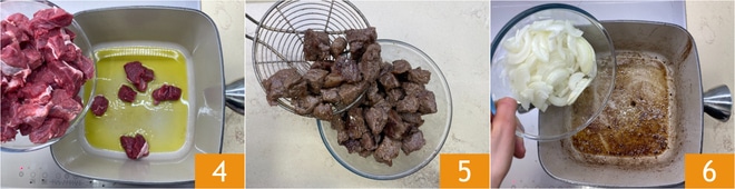 En una cacerola, verted el aceite, añadid la carne 4 y dorad a fuego medio-alto hasta que quede dorada. Retirad la carne 5 y reservadla. En la misma cacerola, poned la cebolla 6.