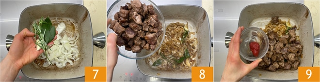 Añadid también los dientes de ajo machacados con piel, el laurel y el romero 7. Sofreíd hasta que las cebollas estén transparentes; si es necesario, añadid un poco más de aceite. Agregad la carne 8, mezclad y cocinad durante unos minutos. Añadid el concentrado de tomate 9.