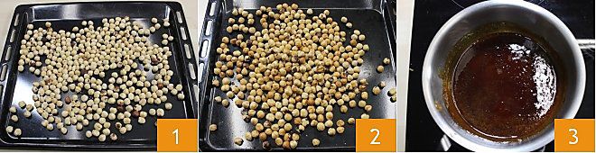 Para preparar los bombones, comienza tostando las avellanas poniéndolas en una bandeja de horno 1 en horno ya caliente a 150° durante 35 minutos, hasta que estén bien doradas 2. Mientras tanto, prepara el caramelo (Caramelo más indicaciones): en un cazo de acero con doble fondo, añade el azúcar granulada una cucharada a la vez en el cazo y déjala derretir lentamente a fuego bajo, sin mezclar pero girando delicadamente el cazo. Debes obtener un caramelo marrón 3, cuya temperatura debe oscilar entre 166°-175° (ayúdate con un termómetro para alimentos).