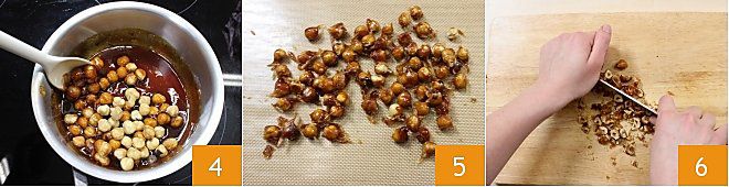 Añade al caramelo la mitad de las avellanas tostadas y mezcla muy rápidamente 4. Coloca todo sobre una alfombrilla de silicona y separa las avellanas unas de otras 5. Ayúdate con un palillo de madera para no quemarte las manos. Debe ser una operación muy rápida, de lo contrario las avellanas no se despegarán más. Una vez enfriadas, pica tanto las avellanas tostadas como las caramelizadas, con un cuchillo de cocina 6 o, si prefieres, con un procesador de alimentos (depende de si prefieres tener trozos de avellana más o menos grandes).