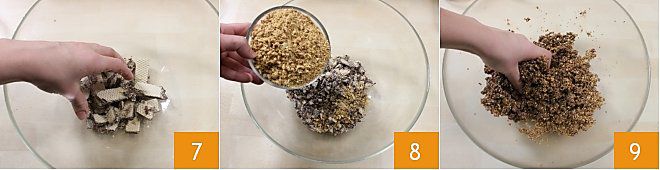 Ahora completa el relleno que estará dentro de los bombones: en un bol desmenuza groseramente con las manos las obleas 7 y añade las avellanas picadas 8. Mezcla un poco con las manos, para que la crema de las obleas se derrita un poco y los ingredientes se amalgamen entre sí 9.