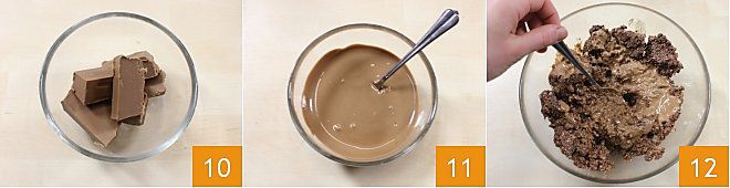 Derrite el chocolate gianduja en el microondas o al baño maría (10-11) y añádelo a la mezcla de obleas y avellanas. Mezcla bien 12: el relleno de los bombones debe ser suave y compacto.