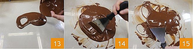 En este punto, derrite el chocolate negro. Para que los bombones resulten bien brillantes y no opacos y blanquecinos, el chocolate deberá ser templado, es decir, no deberá superar nunca los 31°: así obtendrás bombones brillantes que podrán conservarse más tiempo. Para realizar esta operación hay dos posibilidades: o derrites el chocolate al baño maría y, provisto de un termómetro, continúas mezclando hasta que esté derretido manteniendo la temperatura requerida. Si superas los 31°, deberás llevar el chocolate a 45° máximo 50° y, cuando haya llegado a la temperatura, verterás 2/3 sobre una superficie de mármol (no es posible hacerlo sobre otras superficies) 13 y, con una espátula, deberás moverlo rápidamente (14-15), revolviendo continuamente, hasta que haya alcanzado la temperatura de 29°. Luego viértelo en el bol junto con el chocolate restante y mezcla continuamente, hasta llevarlo a 31°.
