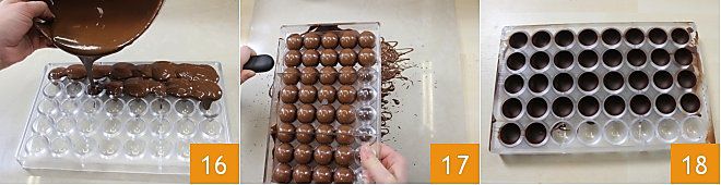 Toma ahora un molde de policarbonato para bombones y vierte dentro bastante chocolate derretido 16, da la vuelta al molde y golpéalo del lado para que el exceso de chocolate escurra completamente 17. Elimina más chocolate sobrante ayudándote con una espátula; realiza esta operación, que sirve para crear la camisa del bombón, es decir, la estructura exterior, sobre una bandeja para recuperar el chocolate que escurre. Déjalos enfriar rápidamente por un par de horas, hasta que se formen pequeñas burbujas blancas debajo 18.