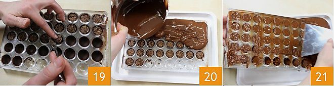 Llena las camisas obtenidas con una cucharadita de relleno 19, cuidando de no llegar hasta el borde, dejando 2-3 milímetros de espacio. Derrite nuevamente el chocolate, repitiendo el templado, y, una vez alcanzados los 31°, viértelo sobre los bombones 20, así para crear el fondo, y elimina el exceso ayudándote con una espátula 21.