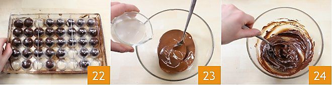 Deja enfriar los bombones por un par de horas. Cuando estén bien duros, desmóldalos: golpea suavemente el molde sobre una superficie plana 22 y se despegarán. Colócalos en una bandeja o plato para servir y prepara la ganache para la decoración: derrite el chocolate, añade la nata 23 y mezcla para amalgamar 24. Transfiere la ganache a una manga pastelera con boquilla de estrella estrecha.